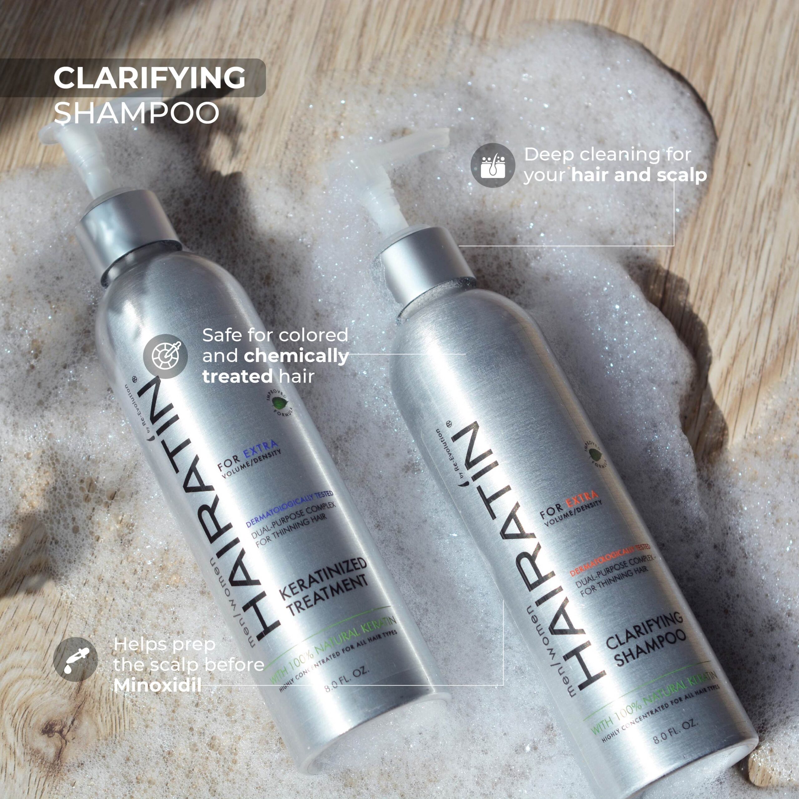 The use of hair products like gel, mousse, waxes, daily regular shampoo or conditioner and even the chloride of tap water leaves build-ups on your hair that can weigh it down. Hairatin Clarifying shampoo will deep clean your hair and remove those build-ups to enhance the vitality and thickness of your hair.